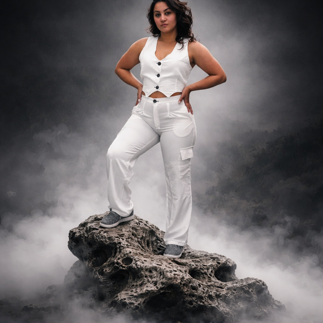 - Top: Tuxedo-style shirt with sleek black outline detailing throughout — structured enough to look intentional, relaxed enough to feel effortless